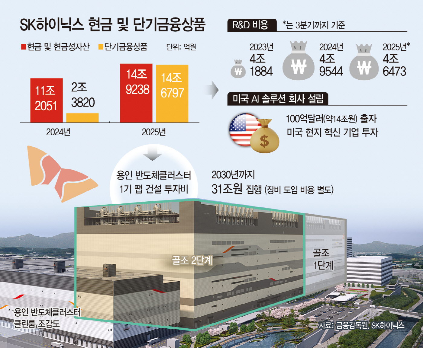 SK하이닉스가 현금성 자산과 단기금융상품만 총 30조원을 보유하고 있는 것으로 나타났다. 언제든지 바로 투입할 수 있는 재원을 크게 늘린 이유는 시설 건립과 해외에서의 인공지능(AI) 기업 투자, 그리고 연구개발(R&D) 비용을 당분간 큰 규모로 쓸 계획이 잡혀있기 때문이다.