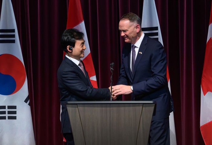 | 안규백 국방부 장관이 25일(현지시간) 캐나다 오타와에서 열린 캐나다 오타와에서 열린 제2차 한-캐나다 외교·국방(2+2) 장관회의 계기 공동기자회견에서 캐나다 국방장관과 악수하고 있다. /국방부 |