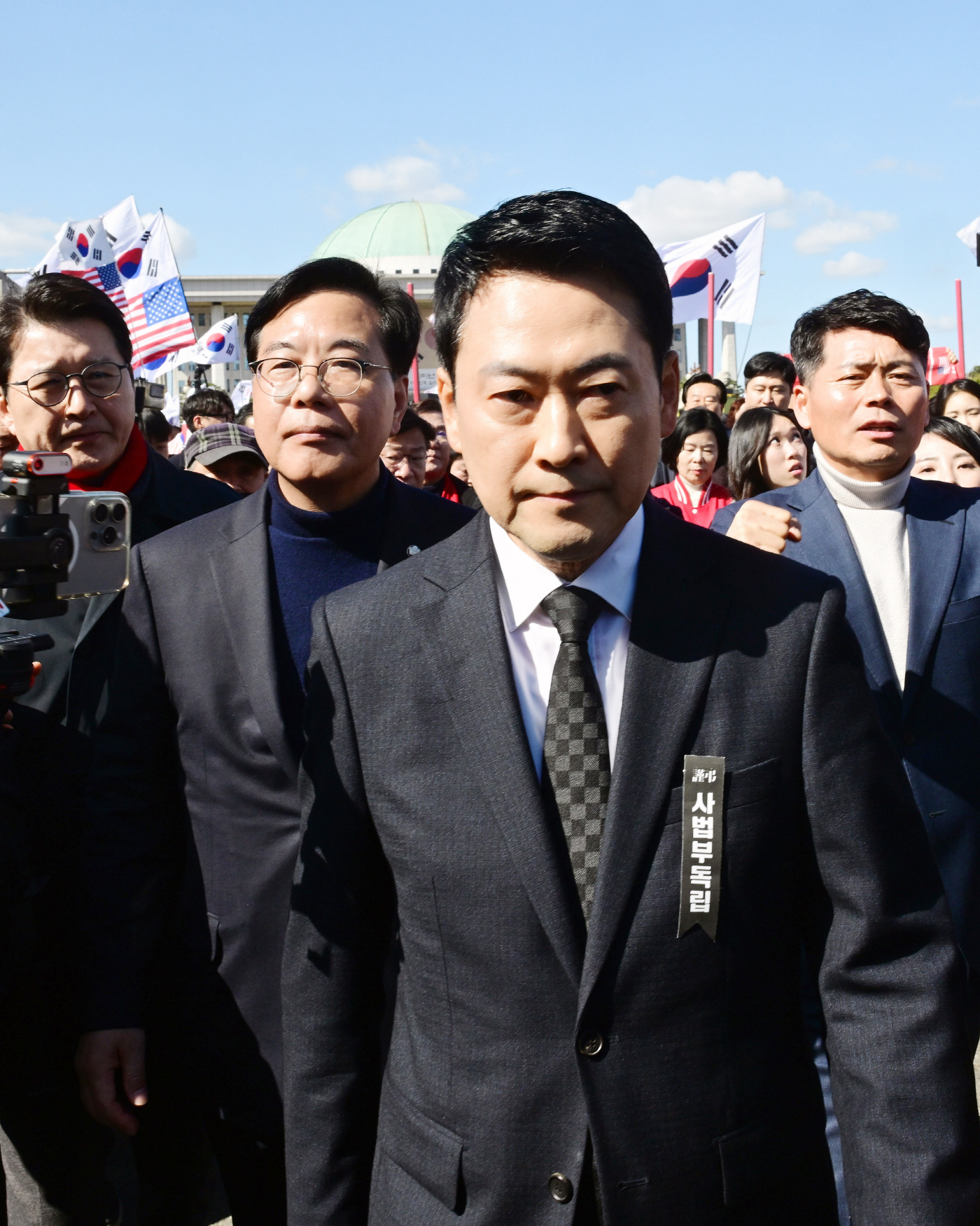 이날 현장은 더불어민주당 주도로 처리된 이른바 '사법 3법'을 규탄하는 집회이자 장외투쟁의 출정식 성격을 띠었다. 계단 앞에 선 의원들이 든 피켓에는 "삼권분립 파괴 당장 중단하라", "사법파괴 독재완성", "사법파괴 3법 대통령은 거부하라" 등의 문구가 적혔다. 무대 사회를 맡은 임이자 의원의 선창에 맞춰 구호가 한 차례 터져 나온 뒤 국기에 대한 경례와 묵념이 이어졌고, 다시 규탄 구호가 반복되며 집회 분위기는 더욱 달아올랐다.
