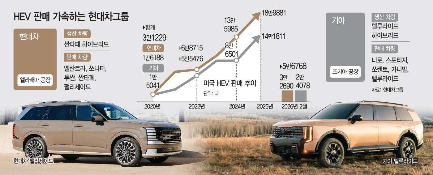 현대차그룹의 미국 친환경차 판매는 하이브리드를 중심으로 꾸준한 성장세를 이어가고 있다. 현대차는 지난해 미국에서 하이브리드 18만9881대를 판매하며 역대 최대 기록을 세웠다. 기아 역시 스포티지 하이브리드와 카니발 하이브리드 등을 앞세워 판매 확대에 속도를 내고 있다. 지난해 미국에서 하이브리드 모델만 14만1811대를 팔았다. 현대차와 기아 모두 2020년 이후 하이브리드 판매는 지속 증가세를 기록하고 있다.