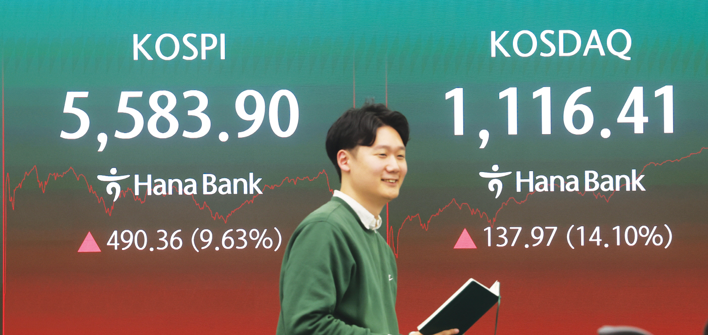 5일 한국거래소에 따르면 코스피 지수는 전 거래일 대비 490.36포인트(9.63%) 오른 5583.90에 마감했다. 상승폭 기준으로는 지난달 3일 기록한 기존 최대치(338.41포인트)를 넘어선 역대 최대 기록이다. 상승률 역시 2008년 10월 30일(11.95%) 이후 두 번째로 높은 수준이다. 개인이 1조7964억원순매수한 가운데 외국인이 1455억원, 기관이 1조7187억원 순매도했다.