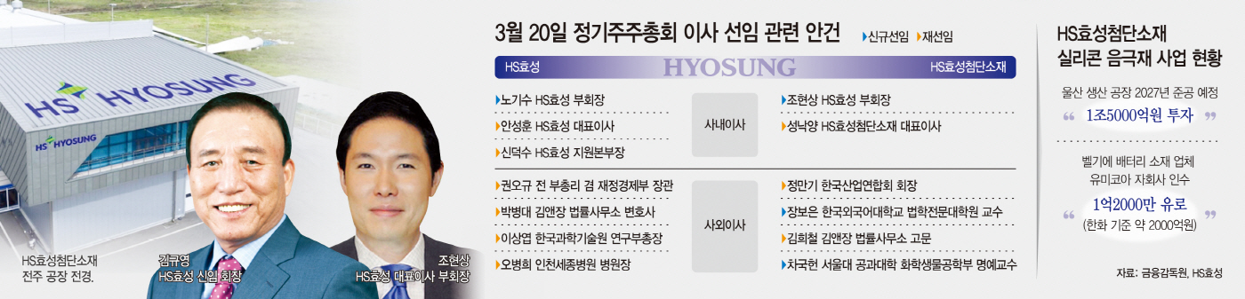 이는 조 부회장이 미래 먹거리로 지목한 실리콘 음극재 사업 등을 HS효성첨단소재에서 직접 챙기기 위한 행보라는 해석이 나온다. 실리콘 음극재는 에너지 밀도가 높은 미래 배터리 소재다. HS효성첨단소재는 1조5000억원을 투입해 오는 2027년까지 울산에 실리콘 음극재 생산 공장을 준공할 예정이다. 지난해 11월 벨기에 배터리 소재 업체인 유미코아의 자회사를 1억200만 유로(약 2000억원)에 인수하기도 했다.