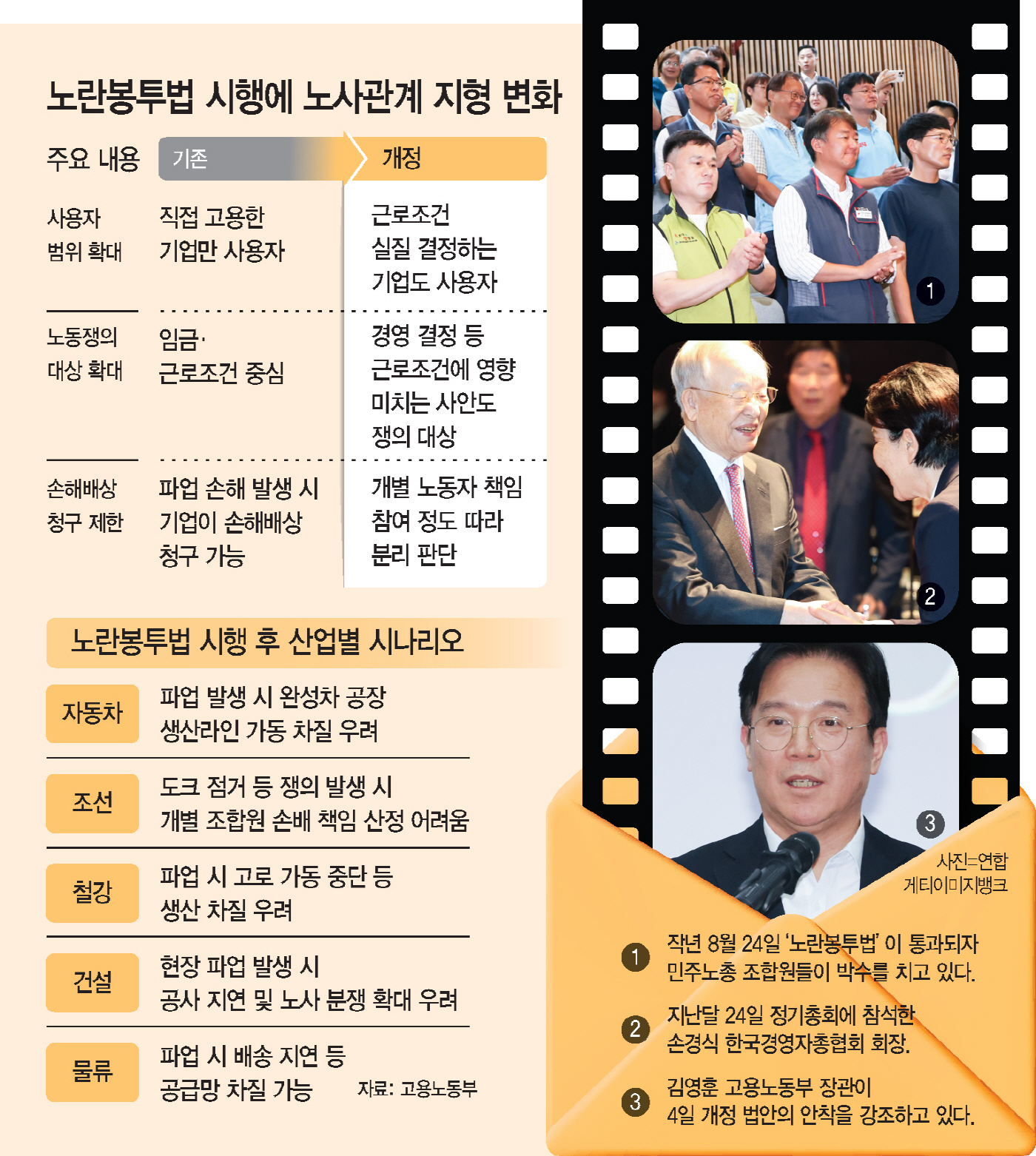 대표적으로 수천 개의 협력사로 구성된 자동차 산업은 법 시행 이후 부담감이 상당할 전망이다. 일례로 특정 부품사 노조가 원청인 완성차 업체를 상대로 직접 교섭을 요구하며 파업에 돌입할 경우, 사실상 생산 자체가 마비될 가능성이 높다. 민주노총 산하 금속노조는 지난달 현대차와 기아, 한국GM 등 13개 원청사를 상대로 143개 하청 노조가 직접 교섭을 요구했다고 밝히기도 했다.