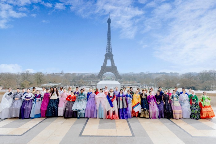 ‘제6회 프랑스 한복모델 선발대회’ 참가자들이 파리 에펠탑 앞에서 포즈를 취하고 있다. / 사진=대한민국 한복모델 선발대회 조직위원회 제공