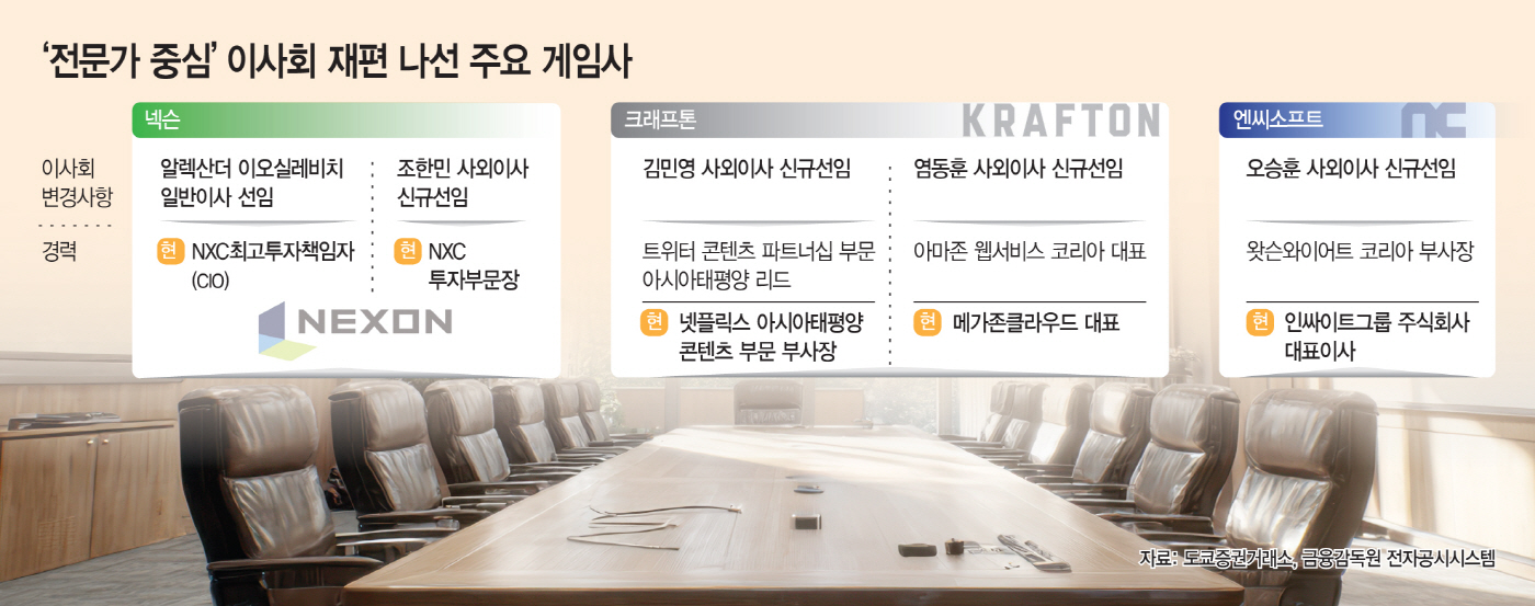 10일 넥슨, 크래프톤, 엔씨소프트, 넷마블 등 게임사들에 따르면 이달 말 열리는 정기 주주총회에서 신규 이사 선임 등 안건을 상정하고 이사회 구성을 조정할 계획이다.
