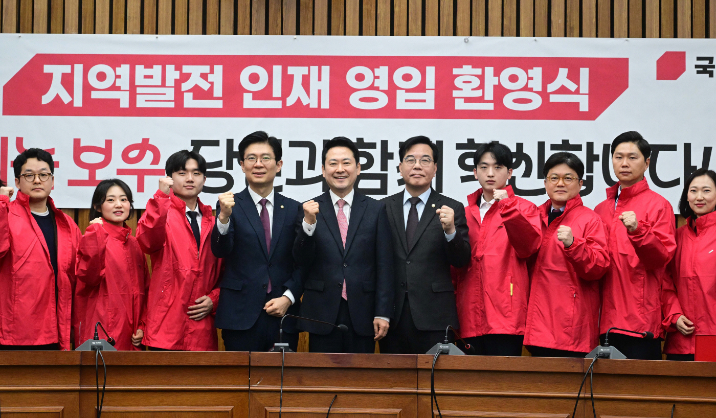 11일 정치권에 따르면 국민의힘은 이날 오전 국회에서 '지역발전 영입인재 환영식'을 열고 2차부터 4차까지 발표한 청년 인재 16명을 공개했다. 행사에는 장동혁 대표와 송언석 원내대표, 조정훈 인재영입위원장 등이 참석했다. 장 대표는 영입 인재들에게 빨간 점퍼를 입혀줬고, 송 원내대표는 '시크릿 박스'를 전달했다.