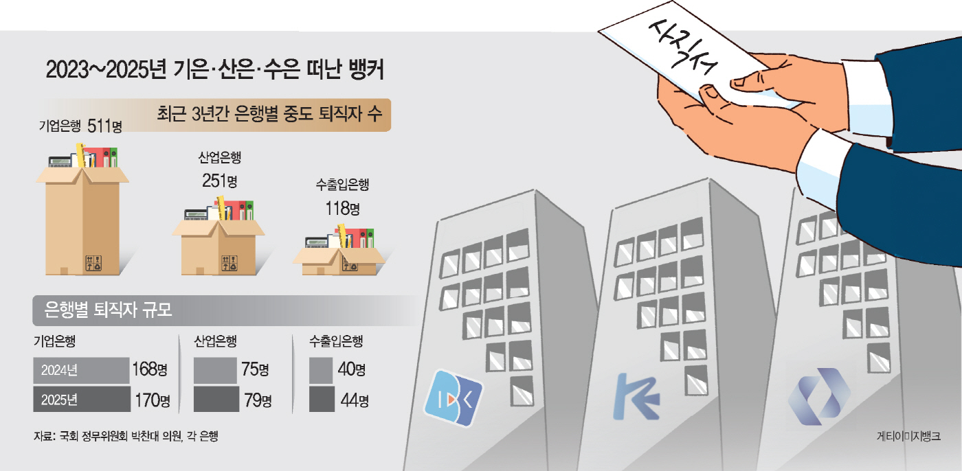 은행별로 보면 기업은행 직원 511명이 은행을 떠났고, 산업은행 251명, 수출입은행 직원 118명이 정년 전에 중도 퇴직했다.