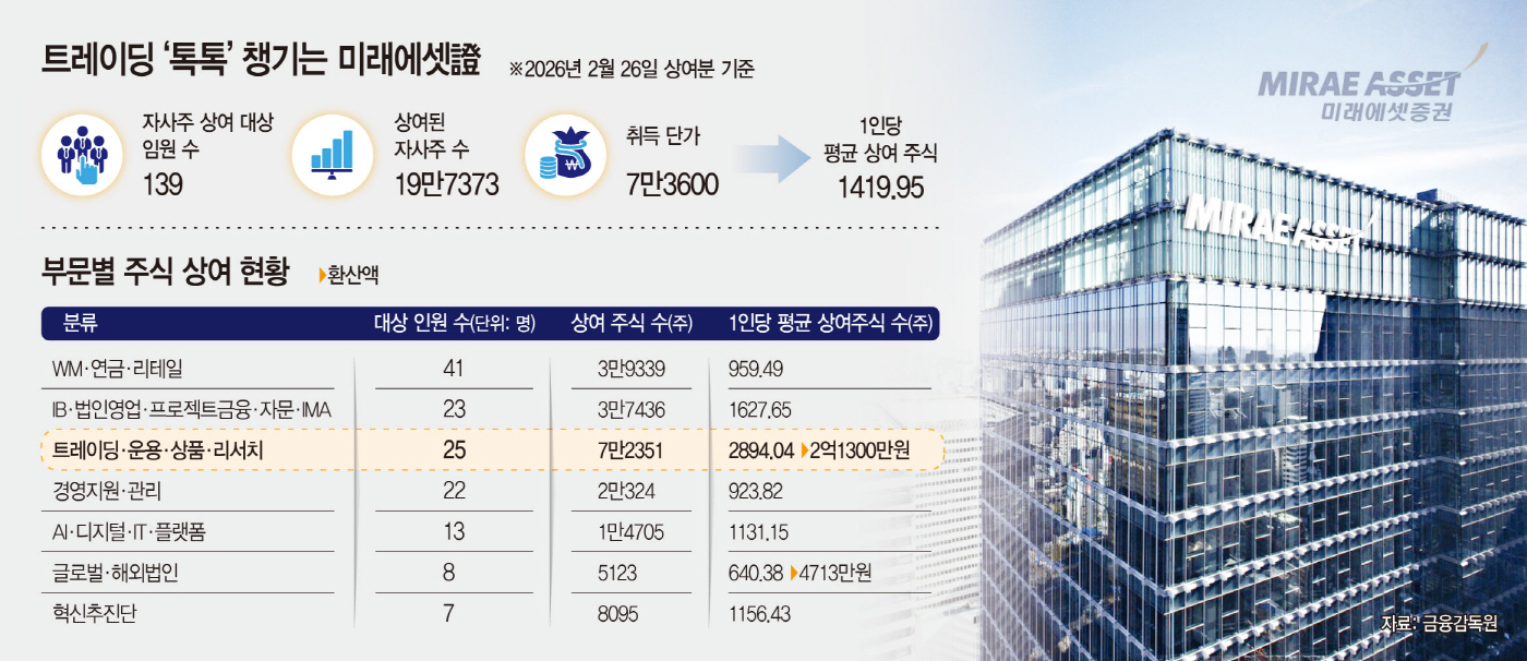 이 가운데 특히 눈에 띄는 건 트레이딩·운용·상품·리서치 부문 임원 25명에 대한 자사주 상여다. 이 부문 임원진에겐 총 7만2351주가 지급됐다. 1인당 평균 2894주를 받아, 지급 당시 주가 기준으로 약 2억1300만원어치의 상여를 받은 셈이다. 전체 평균(1인당 1420주)과 비교하면 두 배가 넘는 수준이다.