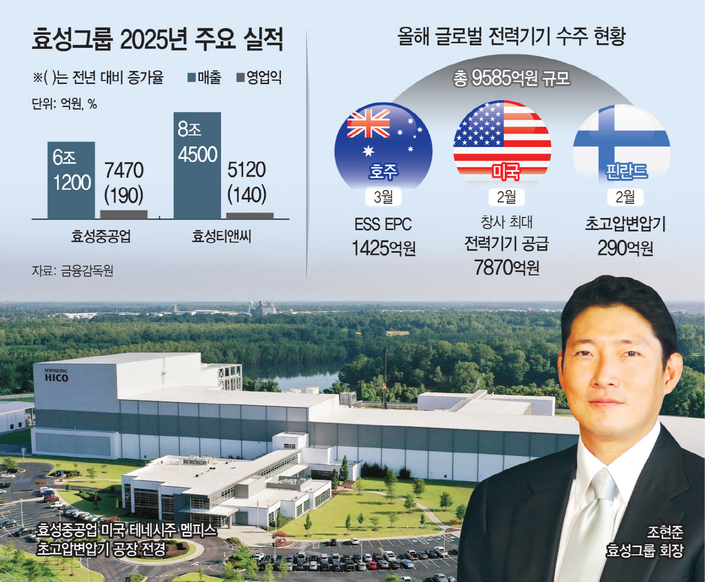 60년 전통의 효성그룹 사업 포트폴리오가 AI 시대에 맞게 빠르게 옷을 갈아입고 있다. 한국을 좁게 보며 이젠 미국과 유럽, 호주까지 대형마켓시장의 AI 전력인프라를 책임지는 효성중공업과 모태인 섬유를 넘어 반도체 공급망과 친환경 소재까지 확장세에 있는 효성티앤씨가 주인공이다. 조현준 회장이 직접 발로 뛰며 구축한 글로벌 네트워크가 잇따른 대형 수주와 투자로 이어지는 중이다.