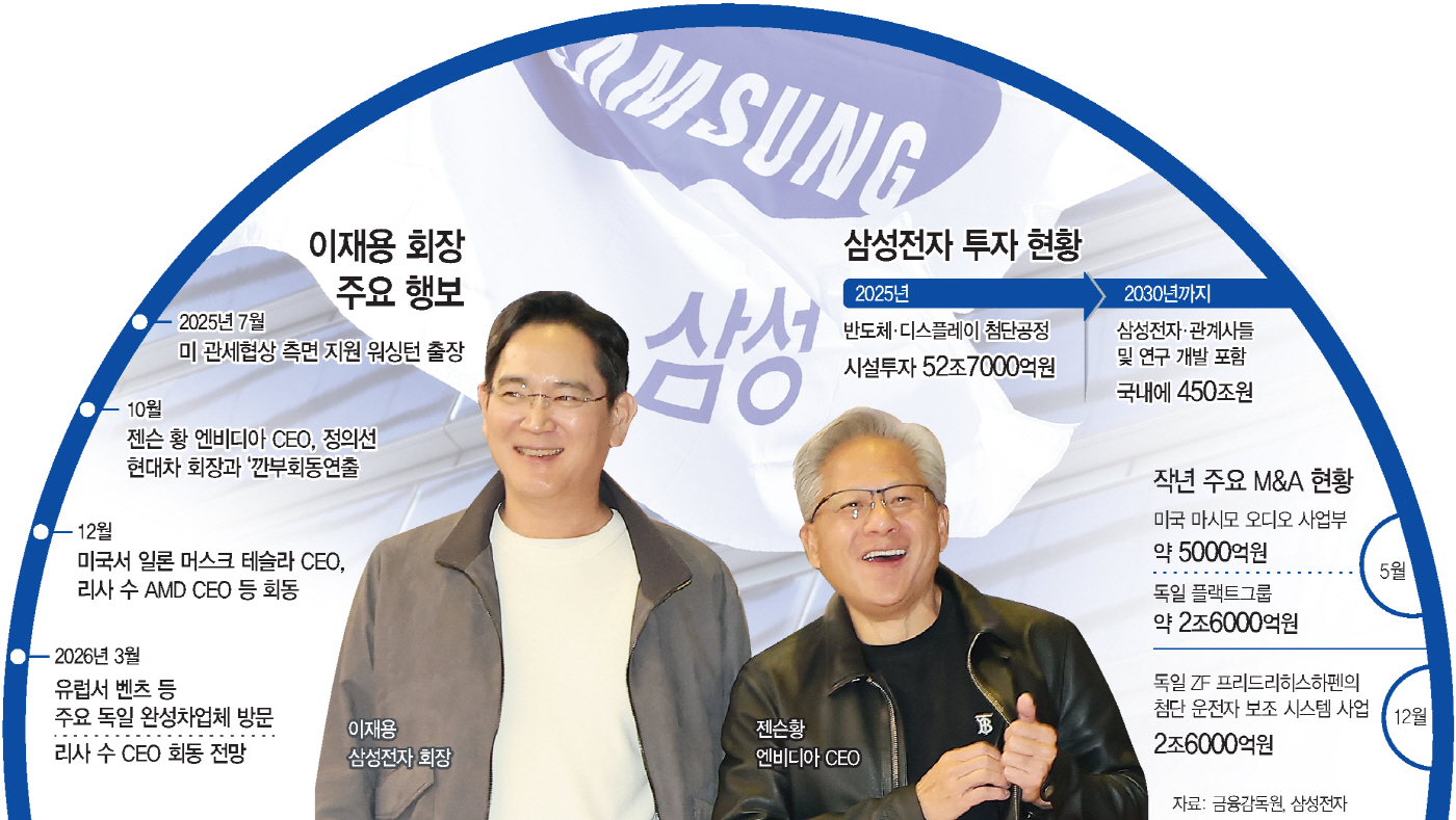 지난해 7월 부당합병·회계부정 혐의 선고에서 최종 무죄를 선고받으며 사법 리스크 족쇄를 풀고 대미 관세 협력까지 측면 지원한 이재용 회장의 경영 행보는, 현재 삼성이 반도체 슈퍼사이클을 200% 누릴 수 있는 경쟁력의 바탕이 됐다. 지난해 10월 젠슨 황 엔비디아 CEO와의 '깐부회동' 같은 상징적 장면이 그 예다. 이달도 글로벌 빅테크 수장들과의 연쇄 회동이 예고 됐다.