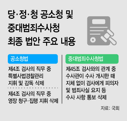 17일 아시아투데이 취재를 종합하면 정부와 더불어민주당(민주당)이 이날 발표한 공소청·중대범죄수사청(중수청) 최종 법안은 공소청 검사의 수사 개입 가능성을 원천적으로 막겠다는 취지로 지휘·개입 관련 조항을 일괄 삭제한 데 방점이 찍혀 있다.