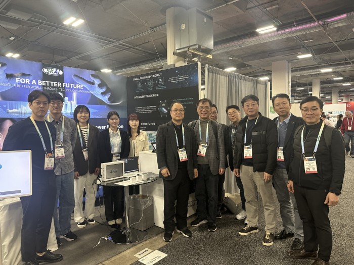 미국 라스베가스에서 개최된 CES(국제전자제품박람회) 2024에서 스카이칩스가 부스를 설치했다. 이강윤 스카이칩스 대표가 유지범 성균관대 총장 등과 기념촬영을 했다. / 사진=스카이칩스
