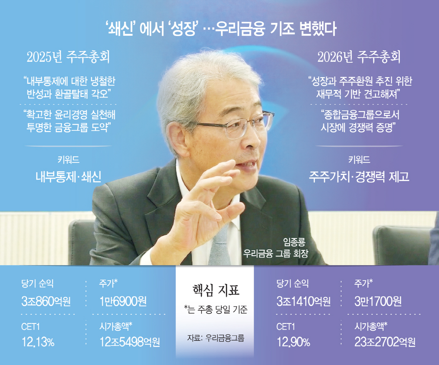 이날 눈길을 끈 대목은 임종룡 회장의 발언이었다. 임 회장은 지난해 우리금융의 재무적 성과와 주주환원 정책을 소개하며 "성장과 주주환원을 함께 추진할 수 있는 재무적 기반이 한층 견고해졌다"고 평가했다. 특히 주가와 시가총액 등 기업가치가 1년 새 큰 폭으로 상승한 점을 언급하면서 시장의 재평가가 이뤄지고 있다고 강조했다. 그는 "지난해 주가 상승률은 금융지주 가운데 가장 높은 89%를 기록했다"며 "이것이 우리금융을 바라보는 시장의 평가"라고 말했다.