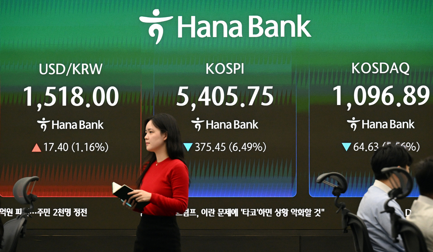 도널드 트럼프 미국 대통령의 '초토화' 발언 이후 중동 상황이 격화될 우려가 커지면서 국내 증시가 6% 넘게 하락했다. 중동 상황 격화 우려로 환율과 원유 가격이 크게 뛰었기 때문이다. 원·달러 환율은 글로벌 금융위기 이후 17년 만에 최고치를 경신하기도 했다. 23일 한국거래소에 따르면 이날 코스피는 전 거래일 대비 6.49%(375.45포인트) 내린 5405.75에 장을 마쳤다. 코스닥도 5.56%(64.63포인트) 하락한 1096.89으로 마감했다.