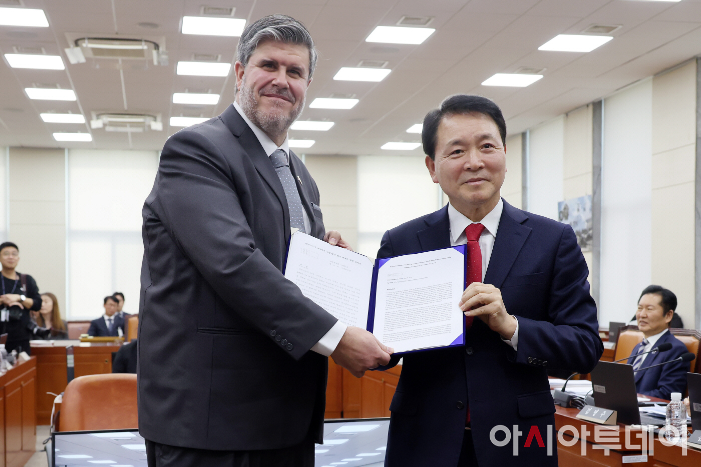 성일종 국회 국방위원장과 필립 라포르튠 주한 캐나다 대사가 24일 국회에서 열린 국방위원회 전체회의에서 대한민국과 캐나다간 국방·방산 협력 확대를 위한 결의안을 의결한 뒤 기념촬영을 하고 있다.