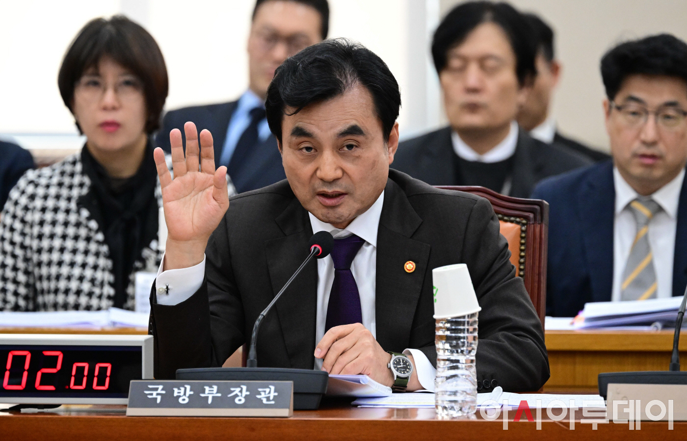 안규백 국방부 장관이 24일 국회에서 열린 국방위원회 전체회의에서 발언 신청을 하고 있다.