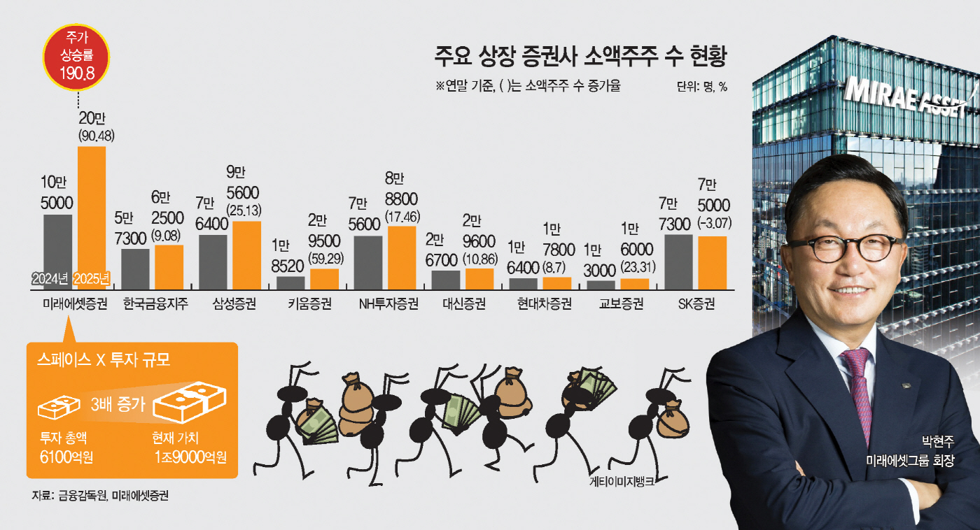 지난해 주요 증권주 상승세가 이어진 가운데 소액주주들이 가장 많이 증가한 곳은 미래에셋증권이었다. 지난 1년간 미래에셋증권에 투자한 소액주주수가 10만명 가까이 급증하면서다. 반도체주 중심으로 거래대금이 급증하면서 증권사들 수익이 늘어난 데다 박현주 미래에셋그룹 회장이 투자를 지시한 스페이스X의 상장 소식이 전해진 점이 크게 작용했다. 미래에셋그룹은 앞서 일론 머스크의 우주 항공 기업 스페이스X에 투자를 단행했는데 현재 투자 가치가 3배가량 상승했다. 향후 스페이스X의 IPO(기업공개)가 성공적으로 마무리된다면 미래에셋그룹이 거둘 수익은 더욱 커질 것이란 분석이다.