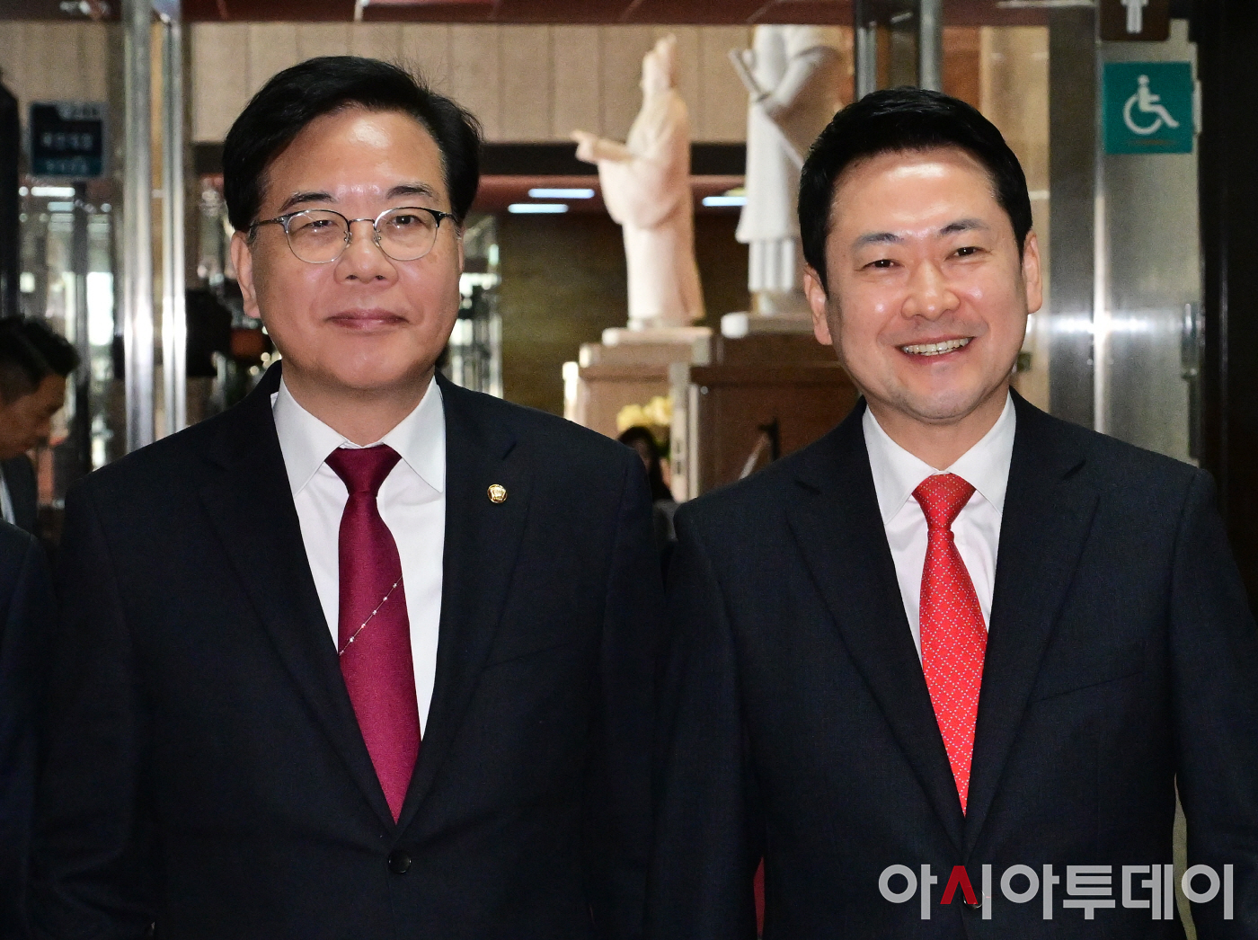 장동혁 국민의힘 대표와 송언석 원내대표가 25일 국회 당대표실에서 비공개 회의를 마친 뒤 함께 원내대표실로 향하고 있다.