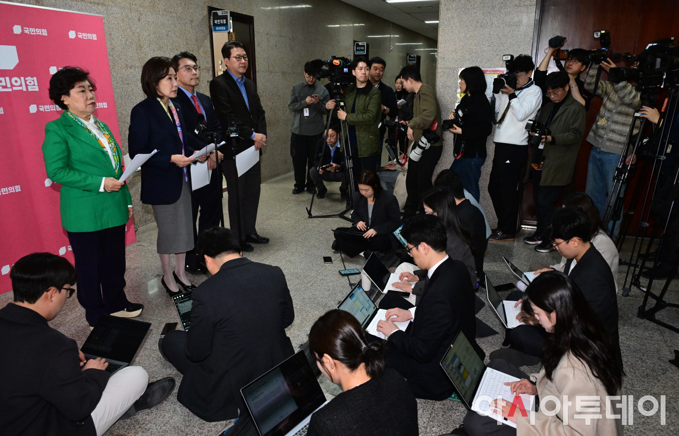 나경원 국민의힘 의원과 법제사법위원회 위원들이 25일 국회 원내대표실 앞에서 민주당의 상임위독식예고 규탄, 법사위원장 야당에 반환 촉구 기자회견을 하고 있다. 왼쪽부터 조배숙, 나경원, 윤상현, 신동욱 의원.