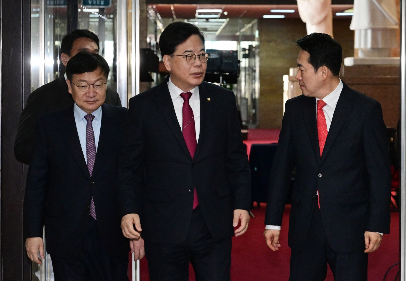 장동혁 국민의힘 대표와 송언석 원내대표가 25일 국회 당대표실에서 비공개 회의를 마친 뒤 지도부와 함께 원내대표실로 향하고 있다. /이병화 기자