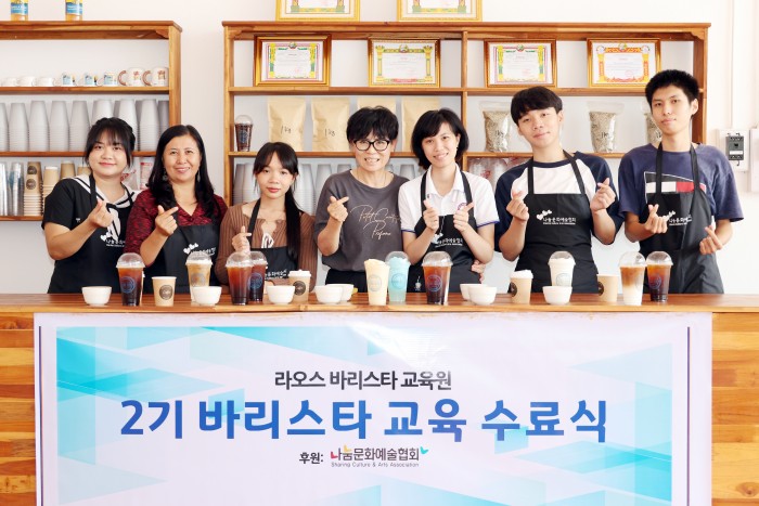 | 유현숙 이사장은 바리스타 강사 자격증을 취득해 라오스 학생들을 가르치고 있다. 바리스타 교육생 수료식. / 사진=나눔문화예술협회 |
