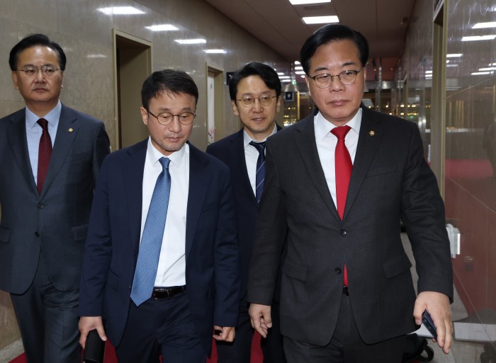 | 한병도 더불어민주당 원내대표와 송언석 국민의힘 원내대표가 30일 서울 여의도 국회에서 열린 국회의장 주재 여야 원내대표 회동에 참석하고 있다. /송의주 기자 |