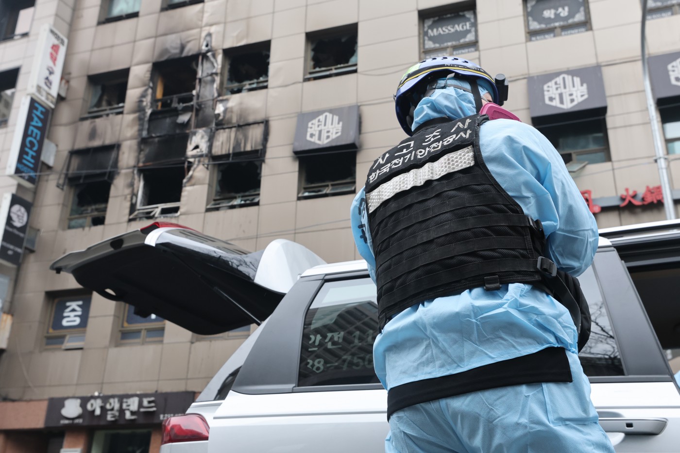 | 지난 15일 서울 중구 소공동 한 캡슐호텔에서 전날 벌어진 화재사고 조사를 위해 열린 경찰ㆍ소방 등 합동감식에서 한국전기안전공사 사고관리 관계자가 화재현장으로 들어가기 위해 장비를 착용하고 있다. /연합 |
