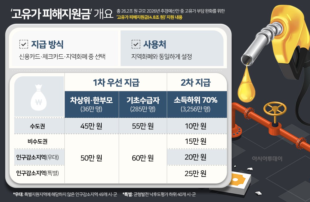 이번 추경안의 핵심은 고유가 피해지원금이다. 행안부는 모두 4조8252억원을 편성해 소득 하위 70% 국민에게 지역과 계층에 따라 차등 지원하기로 했다. 수도권 거주자는 10만원, 비수도권은 15만원, 인구감소 우대지역은 20만원, 인구감소 특별지역은 25만원을 받는다. 한부모가족과 차상위계층은 45만원, 기초생활수급자는 55만원을 지급받고 비수도권 거주자는 1인당 5만원을 추가로 받는다. 이에 따라 차상위·한부모가족은 최대 50만원, 기초생활수급자는 최대 60만원까지 지원받게 된다.