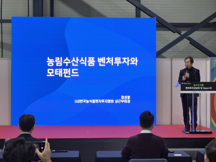한국농식품벤처투자협회 정성봉 상근부회장은 행사 참가자들을 대상으로 ‘농림수산식품 벤처투자와 모태펀드’라는 제목으로 기조 발표를 하고 있다. / 사진=한국농식품벤처투자협회