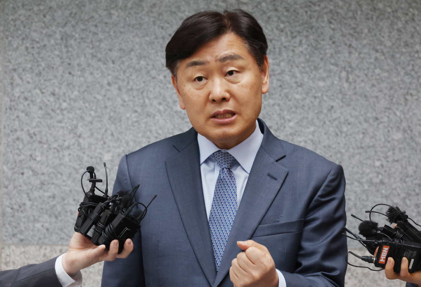 돈 봉투 살포 의혹'에 휩싸인 김관영 전북특별자치도지사가 1일 도청에서 취재진에게 "청년들에게 대리비를 줬다가 회수했다"며 "당 윤리감찰단에 있는 그대로 소명하겠다"고 밝히고 있다. /연합
