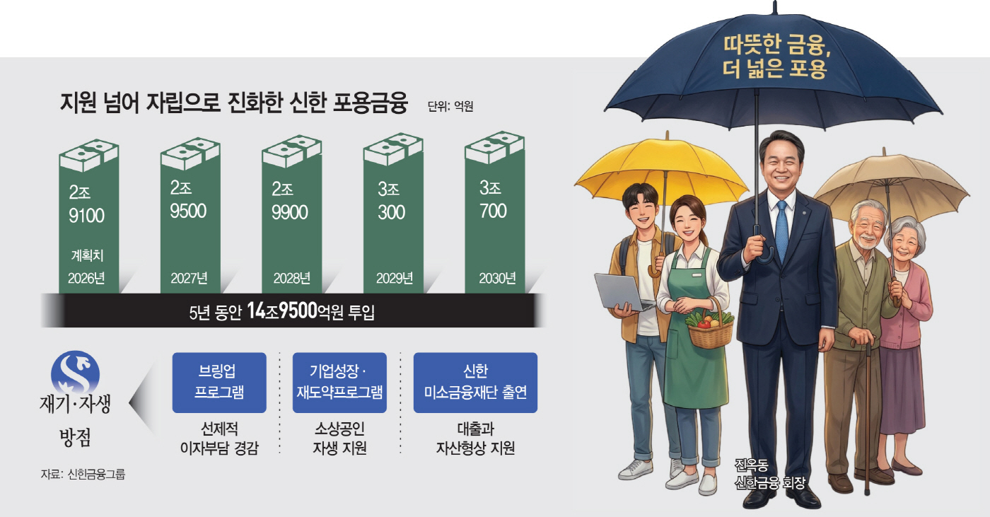 진 회장 2기 체제의 포용금융은 급한 불을 끄는 일회성 자금 공급을 넘어선다. 금융 소외·취약계층의 선제적 이자 경감을 통해 경제적 자립을 유도하는 한편, 중소기업과 소상공인에게는 '기업성공·재도약 프로그램'과 '소호사관학교' 등을 제공해 자생과 재기를 돕는다. 나아가 신한미소금융재단을 통해 청년층의 금융 접근성을 높이고 자산 형성까지 지원하는 등 촘촘하게 금융 사다리를 세우고 있다.