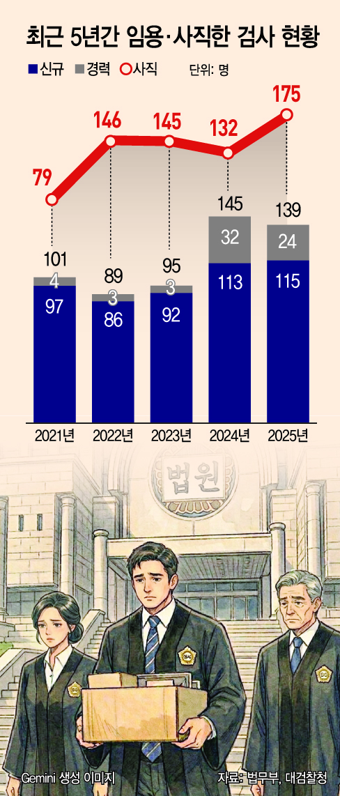 더욱이 같은 기간 새로 임용된 검사 10명 중 9명이 신규 인력이었다. 경력 검사는 2021년 4명, 2022년 3명, 2023년 3명, 2024년 32명, 2025년 24명에 그쳐, 조직을 떠난 허리급 인력을 실무 경험을 갖춘 인력으로 메우지 못했다는 분석이다.