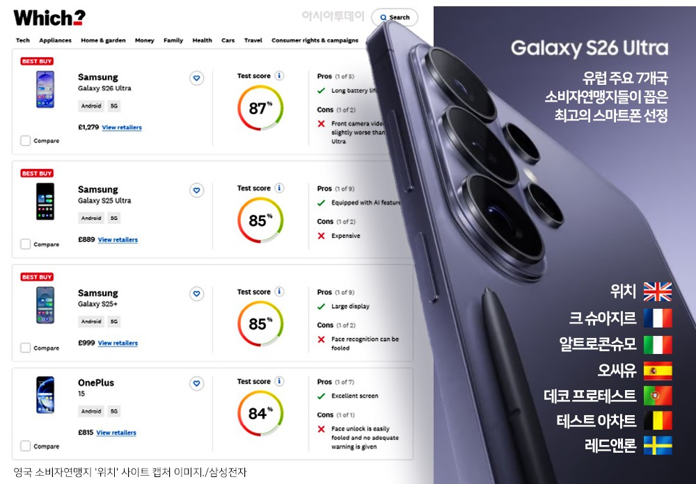 삼성전자 '갤럭시S26 울트라'가 유럽 주요 7개국 소비자연맹지 스마트폰 평가에서 1위를 차지했다.