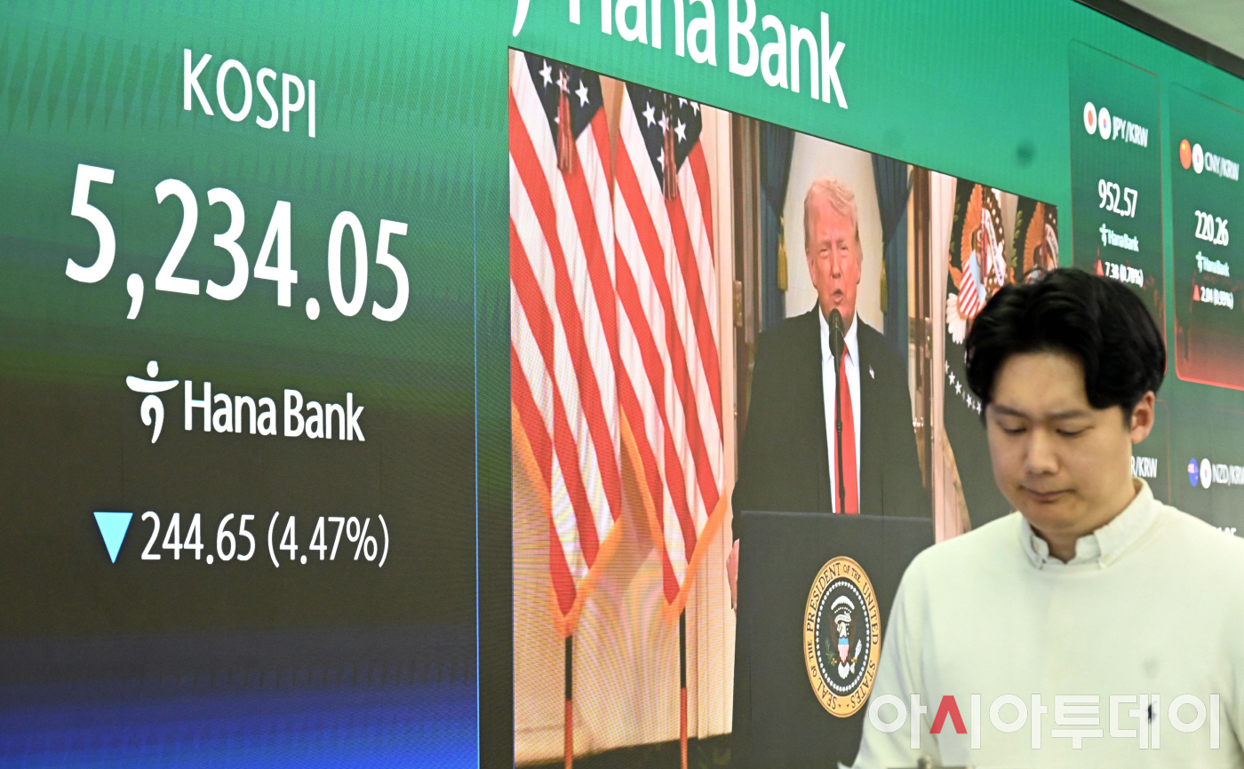 트럼프 대통령 발언전 상승으로 출발했으나 발언 후에는 급락을 하며 코스피는 전장보다 244.65포인트(4.47%) 내린 5,234.05에, 코스닥은 59.84포인트(5.36%) 내린 1,056.34에 장을 마감했고, 환율도 19원(1%) 이상 오른 상태를 유지중이다.