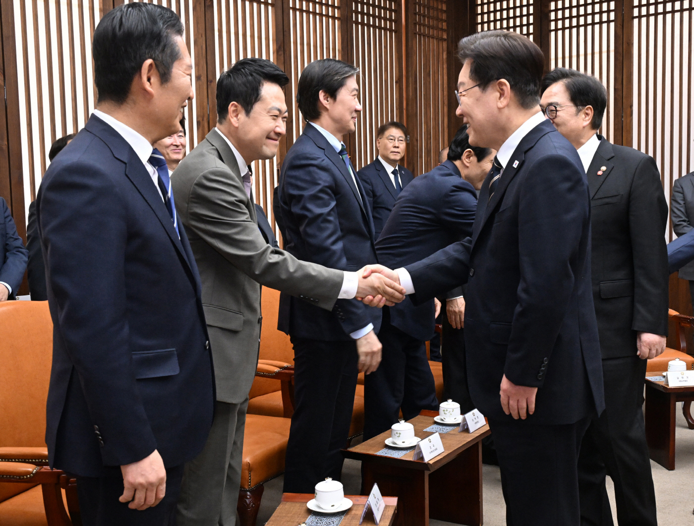 이재명 대통령이 2일 추가경정예산안 시정연설을 위해 국회에 방문해 사전 환담장에서 장동혁 국민의힘 대표(왼쪽 두 번째)와 인사를 나누고 있다. /이병화 기자 photolbh@