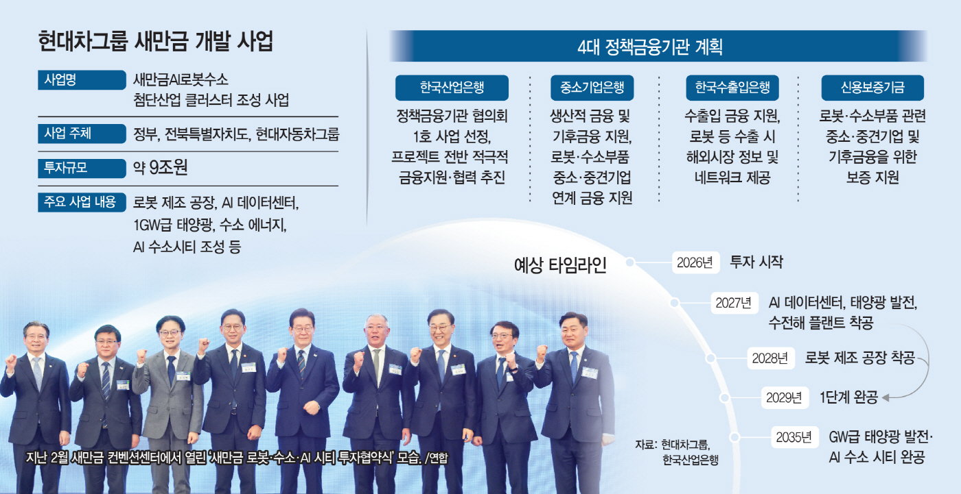 현대자동차그룹이 정책금융기관과 손잡고 전북 새만금을 미래 산업 거점으로 키우는 작업에 속도를 낸다. 현대차그룹은 새만금 112만㎡ 부지에 약 9조원을 투입해 로봇 제조 및 부품 클러스터, 수전해 플랜트, AI 데이터센터, 1GW급 태양광 발전, AI 수소시티 등을 구축할 계획이다. 단순한 투자 유치를 넘어 금융 구조 설계까지 민관이 공동으로 설계해 대규모 첨단 산업 클러스터 구축의 실행력이 한층 강화되는 흐름이다.