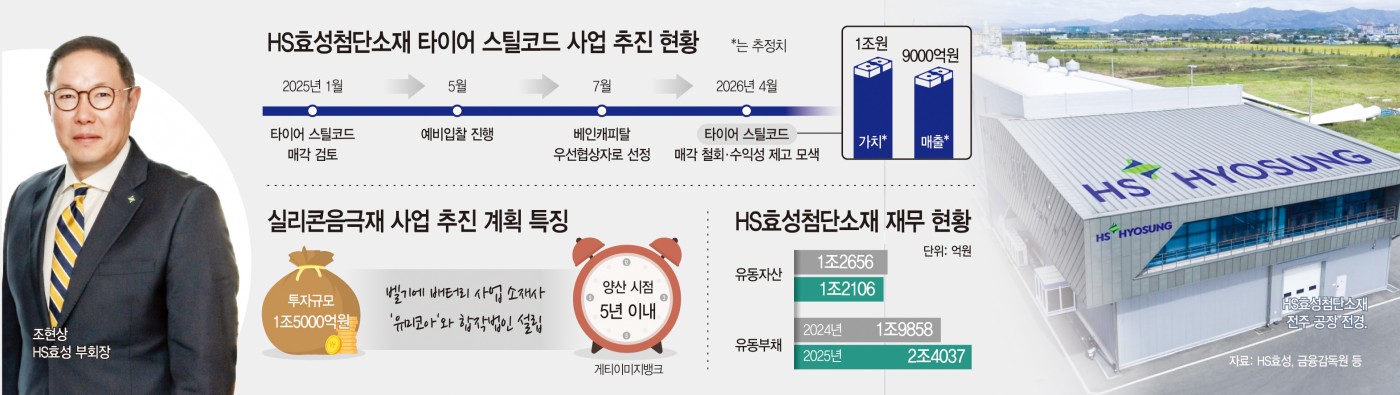 HS효성의 타이어 스틸코드 매각 불발로 실리콘음극재 사업 추진이 차질을 빚게 되자, 조현상 부회장의 고민이 깊어지고 있다. 스틸코드 매각으로 1조원 이상 확보하지 못하면서 미래 성장 동력으로 낙점한 실리콘음극재 사업 계획을 원점에서 재검토하게 됐기 때문이다. 실리콘음극재는 스틸코드 사업과 다르게 글로벌 배터리 시장의 '게임 체인저'로 불리는 차세대 소재로, 조 부회장이 속히 진출하려 했던 사업이다. 이 때문에 추후 스틸코드 사업을 다시 매각하고 실리콘음극재 사업 추진을 앞당길 것이란 분석이 나온다.