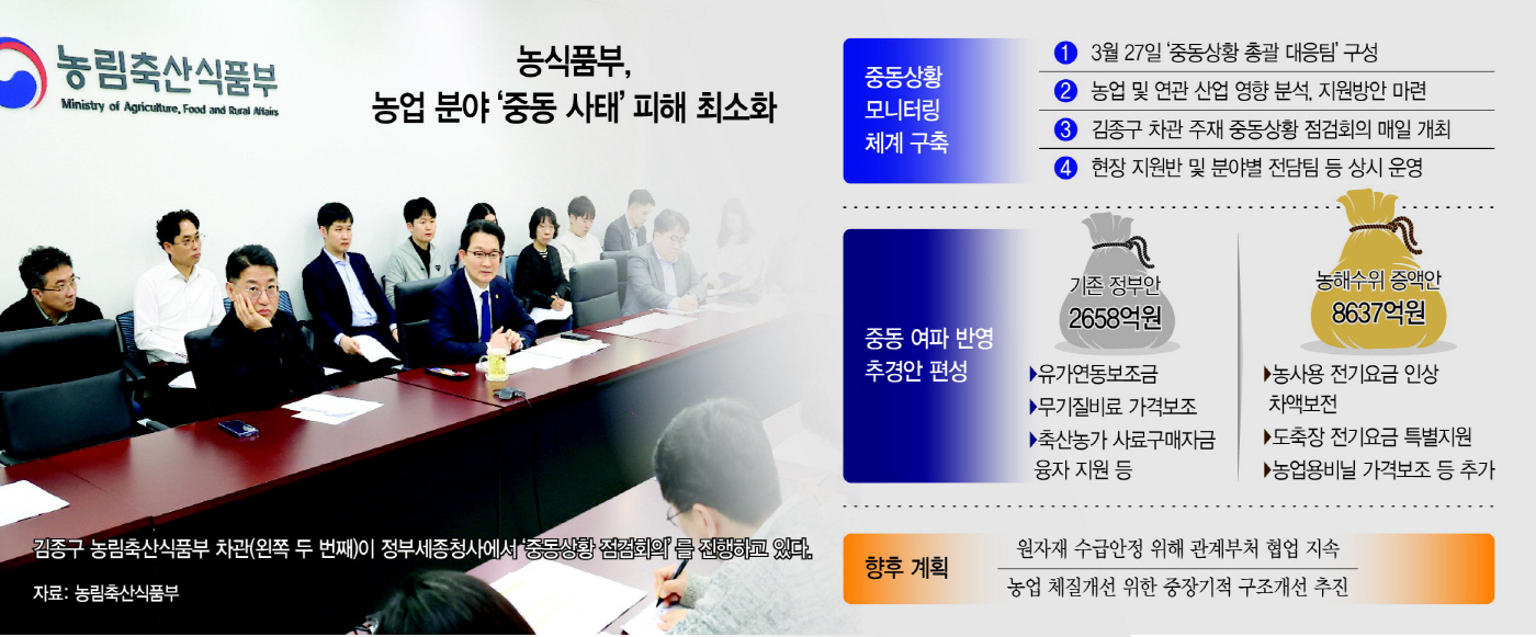 중동 사태 여파는 올해 첫 추가경정예산안(추경)에도 반영됐다. 농식품부는 농가 경영부담 완화를 위해 유가연동보조금 지원, 무기질비료 가격보조, 축산농가 사료구매자금 융자 지원 등을 담은 2658억원 규모 정부안을 제출한 바 있다.