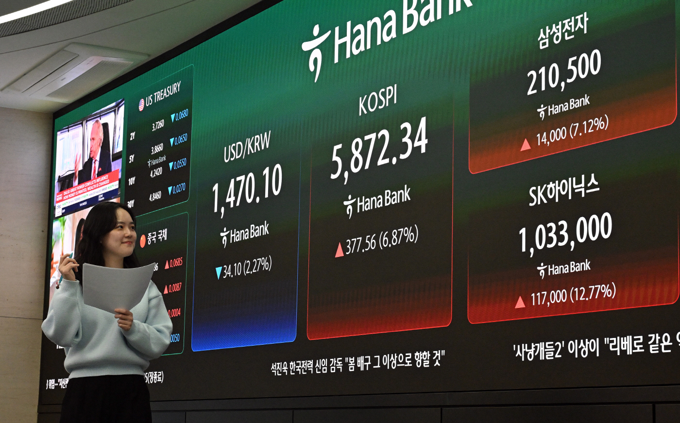 8일 한국거래소에 따르면 이날 코스피는 전 거래일 대비 6.87%(377.56포인트) 오른 5872.34에 정규 거래를 마쳤다. 코스닥 역시 전 거래일 대비 5.12%(53.12포인트) 오른 1089.85에 장을 마무리했다.