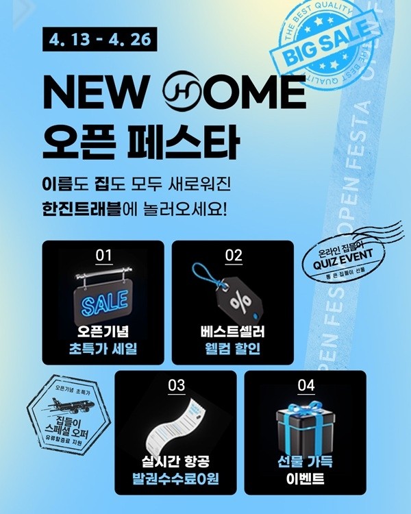 한진트래블은 이번 개편을 기념해 오는 4월 13일부터 26일까지 2주간 ‘뉴홈 오픈 페스타’ 프로모션을 진행한다. 이번 행사는 브랜드 리뉴얼에 맞춰 여행 비용 부담 완화를 고려한 혜택 중심으로 구성된 것이 특징이다.