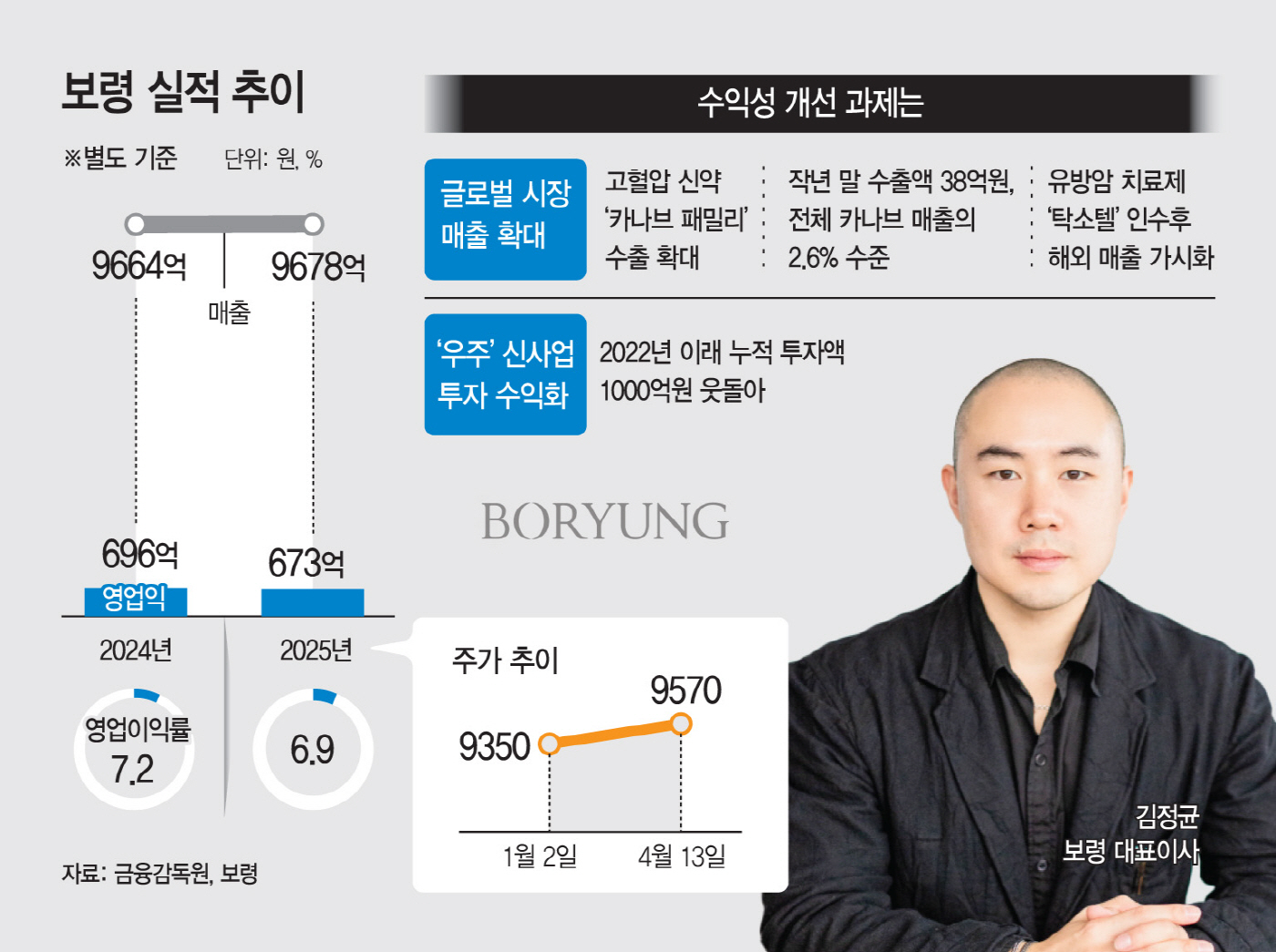13일 업계에 따르면 김 대표는 보령의 수익성 강화를 최우선 과제로 삼고 있지만, 영업이익률은 하락세를 이어가고 있다. 2024년 7.2%였던 영업이익률은 지난해 6.9%로 낮아졌다. 보령의 핵심 캐시카우인 고혈압 치료제 '카나브 패밀리'의 약가 인하가 현실화된 탓이다. 실제로 카나브 패밀리의 매출 비중은 전체 매출의 15%에 달한다. 여기에 제네릭(복제약) 약가 인하까지 본격화될 경우 수익성 부담은 더욱 커질 전망이다.