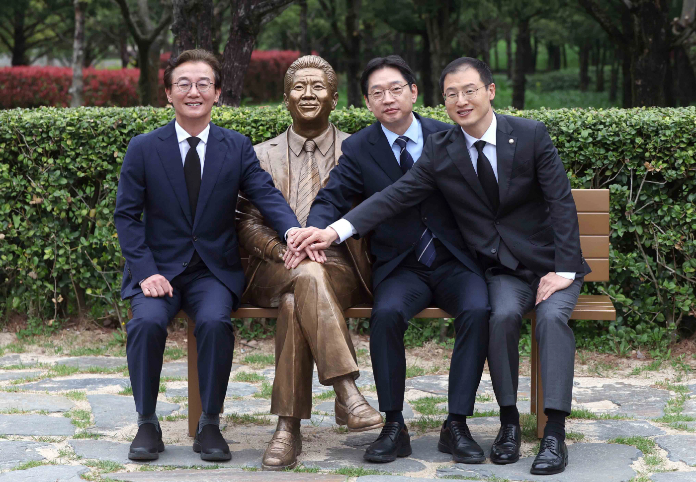 더불어민주당 전재수 부산시장 후보(왼쪽부터), 김경수 경남지사 후보, 김상욱 울산시장 후보 3명이 14일 경남 김해시 진영읍 봉하마을 노무현 전 대통령 묘역 참배 후 노 전 대통령 동상에서 기념 촬영하고 있다. 이날 지방선거 공동 공약으로 '부울경 해양수도 메가시티'를 제시했다. /연합