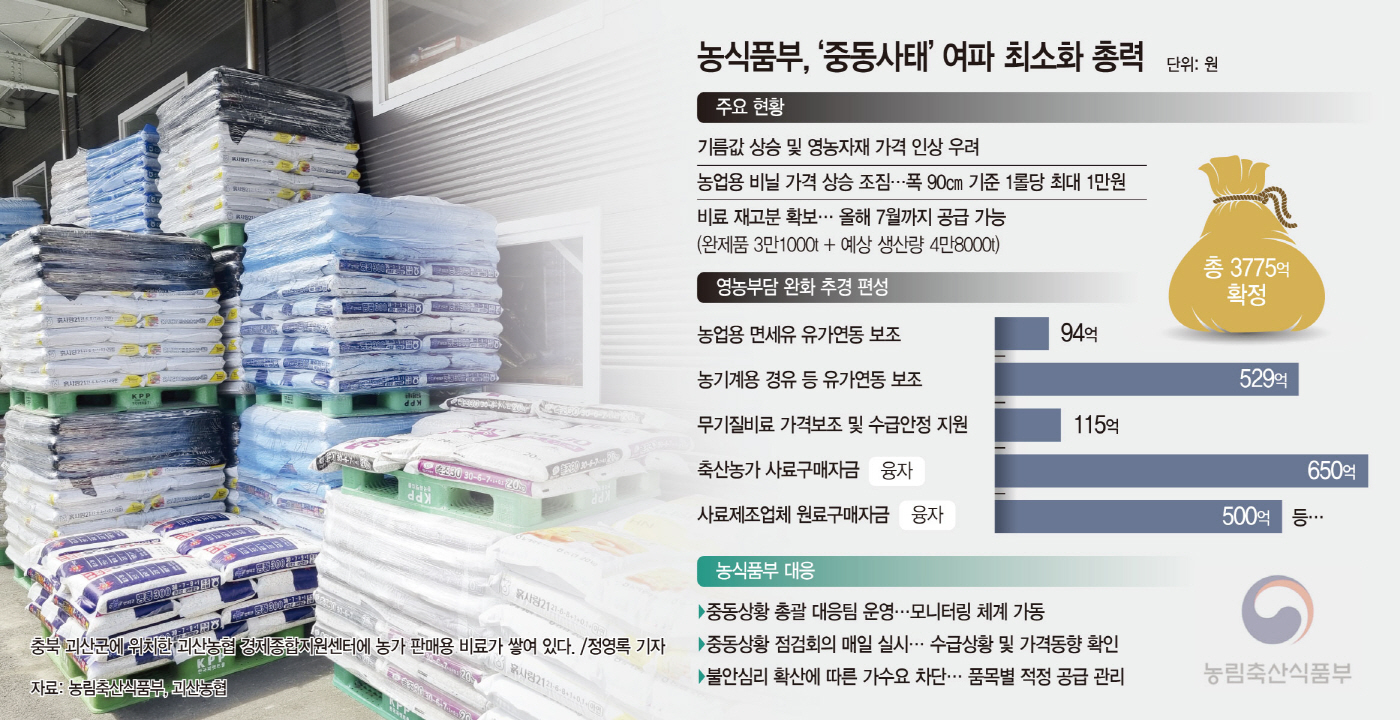 농식품부 관계자는 "현재 중동사태 장기화 등 불안심리에 따른 가수요를 차단하는 것이 중요한 상황"이라며 "농업인 실수요에 맞춰 (영농자재 등이) 적기에 공급·판매될 수 있도록 관리하고, 농가 피해를 최소화할 수 있도록 현장을 지속 점검할 것"이라고 했다.