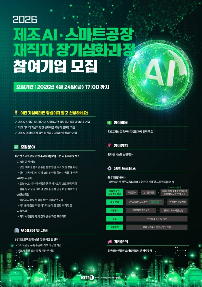 올해 과정은 정부의 ‘스마트제조혁신 3.0’ 정책 방향에 맞춰 제조 분야의 AI 전환(AX) 역량 확보에 집중한다. 모집 분야는 △지능형 공정·예측 △AI 로봇·자동화 △AI 탄소중립 △자율주제 등 4개 영역이며, 총 62개 프로젝트 팀을 선발할 예정이다.