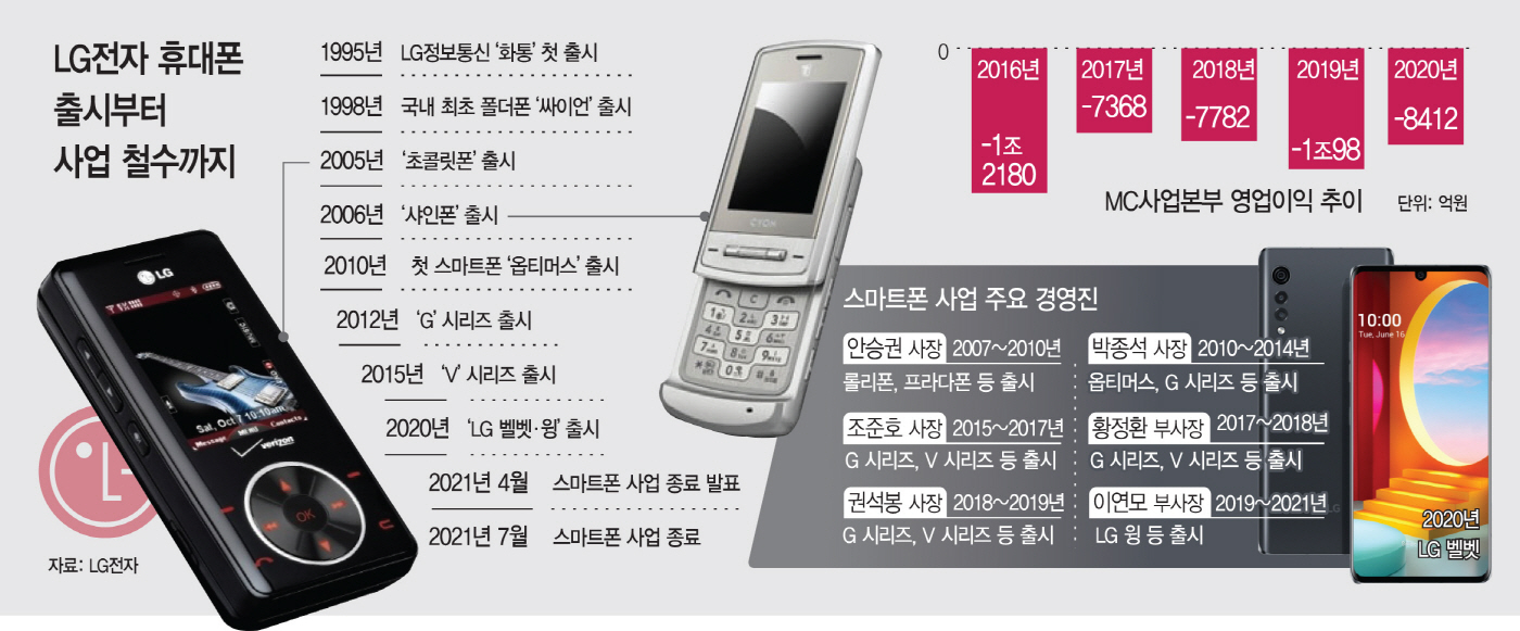 황정환 전 부사장 등 기술 전문가가 뒤늦게 키를 잡았지만, 흐름을 뒤집긴 역부족이었다. MC사업본부는 2015년 2분기를 기점으로 2020년 4분기까지 23개 분기 동안 5조원에 달하는 영업손실을 냈고, 결국 2021년 1월 사업 재조정 계획을 밝힌 데 이어 같은 해 7월 공식 철수했다. 홍기용 인천대 경영학부 교수는 "시장 트렌드를 제대로 파악하지 못한 채 기술 경쟁력에서도 밀리면서 국내 수요조차 제대로 잡지 못한 것이 패착의 가장 큰 원인"이라며 "'전자 사업의 꽃'이라 할 수 있는 스마트폰을 놓으면서 지속 성장을 꾀하기가 어려워진 상황"이라고 설명했다.