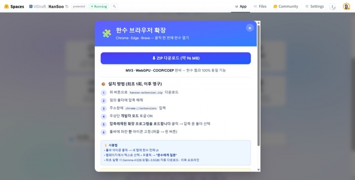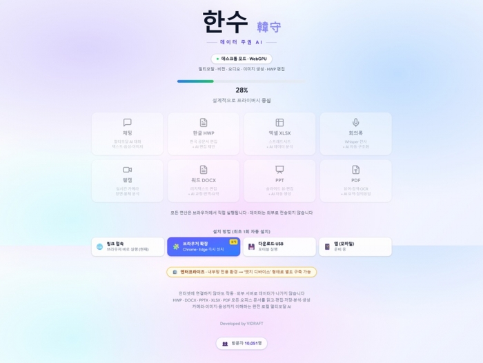 비드래프트는 외부 서버 전송 없이 브라우저에서 직접 실행되는 로컬 AI 서비스 ‘한수(韓守)’를 깃허브와 허깅페이스를 통해 공개했다고 21일 밝혔다.