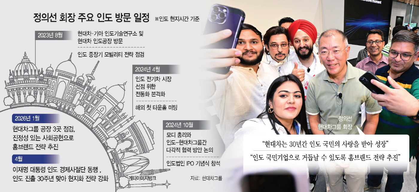 그는 올해 1월 12~13일에도 현대차 첸나이공장·기아 아난타푸르공장·현대차 푸네공장을 방문해 현지 생산 판매 현황과 중장기 발전 전략을 점검했다. 정 회장은 "30년간 인도 국민의 사랑을 받아 성장할 수 있었다"며 "인도 국민기업으로 거듭날 수 있도록 또 다른 30년을 내다보는 홈브랜드 전략을 추진해야 한다"고 강조했다.