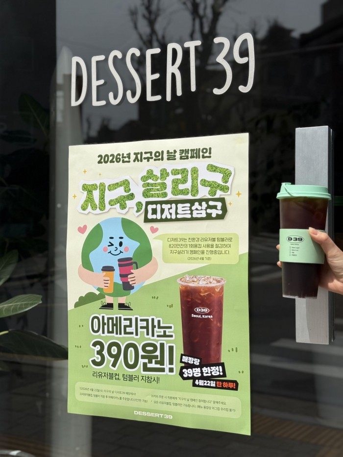 디저트39 관계자는 “리유저블컵 운영을 통해 실질적인 환경 보호 효과를 만들어온 만큼 지구의 날을 맞아 고객과 그 의미를 공유하고자 이번 캠페인을 마련했다”며 “앞으로도 지속 가능한 소비문화 확산을 위한 다양한 친환경 활동을 이어갈 계획”이라고 밝혔다.