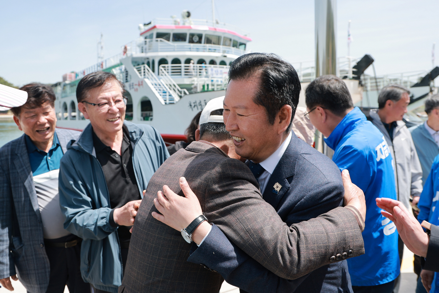정청래 더불어민주당 대표가 21일 경남 통영시 욕지도에 도착해 도민과 포옹하며 인사를 하고 있다. /연합
