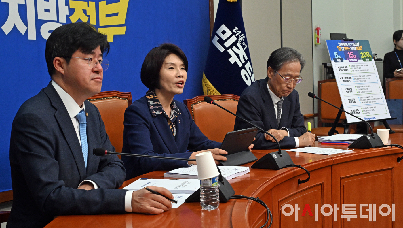 한정애 더불어민주당 정책위의장(가운데)이 22일 국회에서 6·3 지방선거 더불어민주당 공약 발표를 하고 있다.